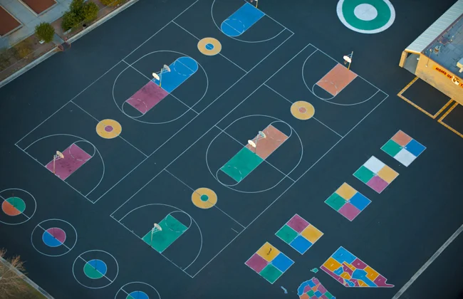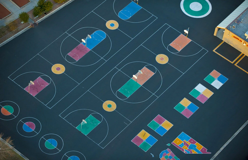 Ярко раскрашенные баскетбольные и игровые площадки, Северный Лас-Вегас, США. (© Jason Hawkes)