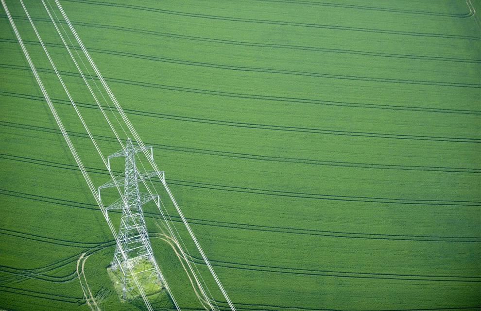 Мачта линии электропередачи в полях близ Littlebury, Эссекс, Великобритания. Google Map (© Jason Hawkes)