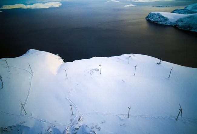 Покрытый снегом ветроэнергоцентр Havygavlen на севере Норвегии. Google Map (© Jason Hawkes)