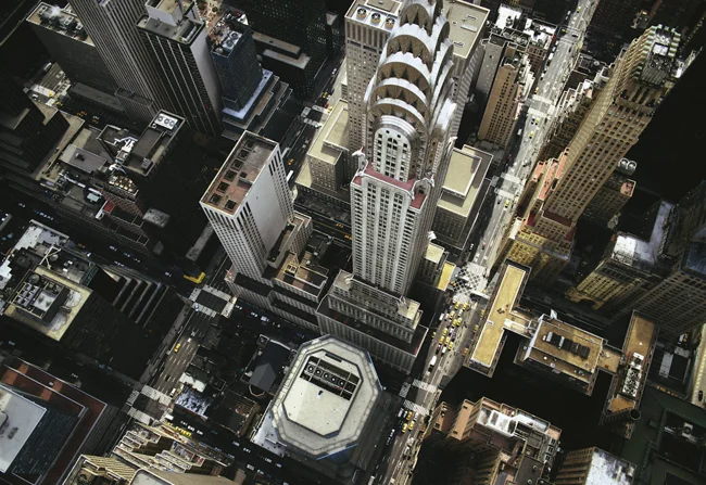 Вид сверху на Chrysler Building, в восточной части Манхэттена, Нью-Йорк. Google Map (© Jason Hawkes)