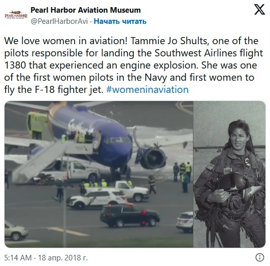 Во вторник, 17 апреля, у самолета Boeing 737 американской компании Southwest Airlines в воздухе загорелся и взорвался двигатель. В результате взрыва осколки двигателя разбили иллюминатор, а сидящую рядом пассажирку, 43-летнюю Дженнифер Риордан, засосало в образовавшееся отверстие. Женщину удалось вытащить, но, к сожалению, позже она скончалась. Жертв было бы намного больше, если бы не капитан Тэмми Джо Шульц (Tammie Jo Shults).
