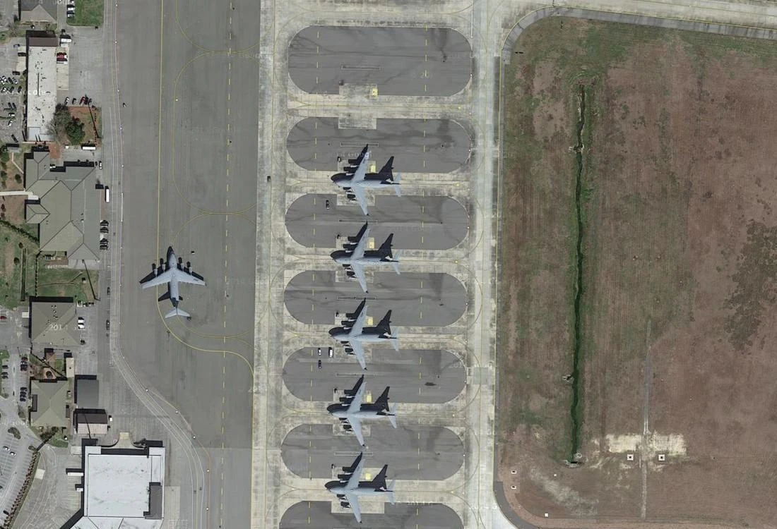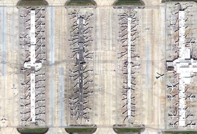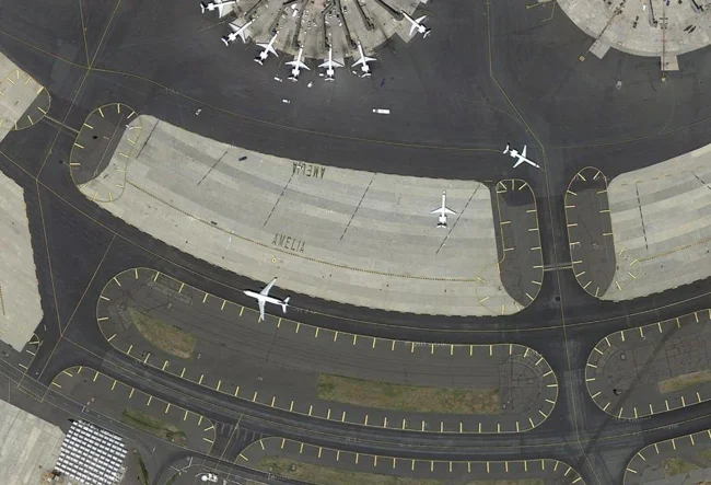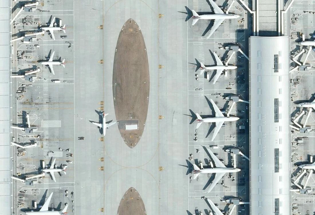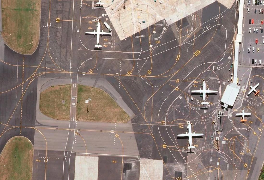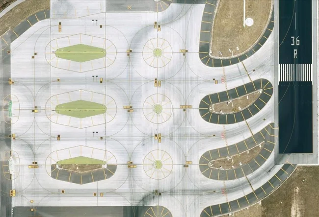 Десятки аккуратно обрезанных изображения выявляют общие черты среди аэропортов. Здесь угадывается определенная логика и порядок, который, казалось бы, является хаотичным.