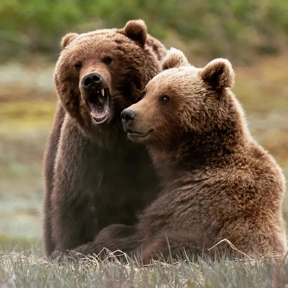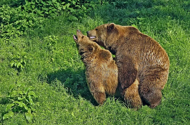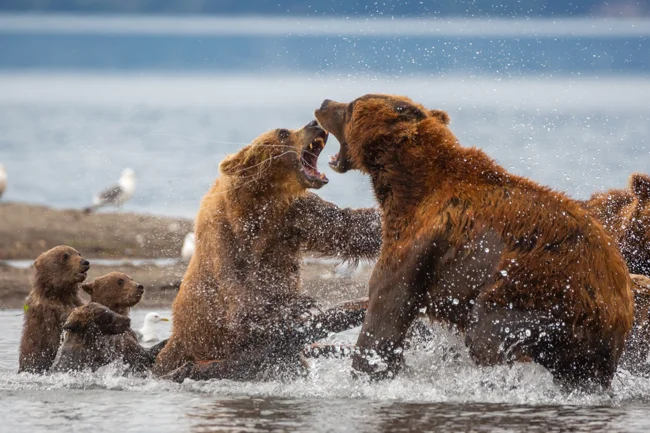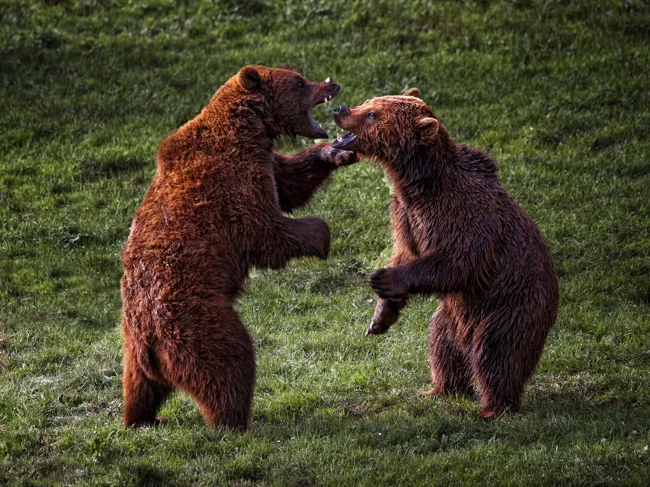 Бой — дело опасное. Поэтому, прежде чем ввязаться в драку, медведи демонстрируют силу: встают на задние лапы, рычат, показывают клыки.