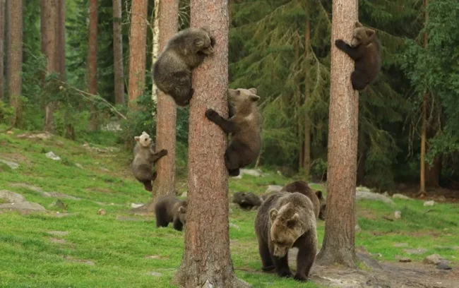 В момент опасности самый лучший выход для медвежонка — залезть на дерево. Карабкаются малыши ни чуть не хуже кошек!