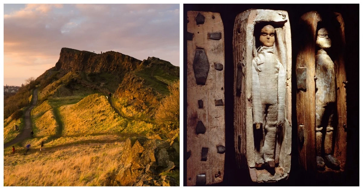 Ребята целый день охотились на кроликов на склонах скалистого холма Трон Артура, когда их внимание привлекла небольшая расщелина, скрытая за плитой сланца. Отодвинув камень, они обнаружили внутри семнадцать маленьких гробиков длиной едва ли десять сантиметров, аккуратно уложенных в три слоя.