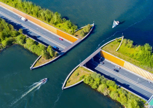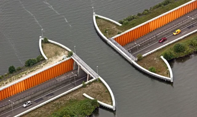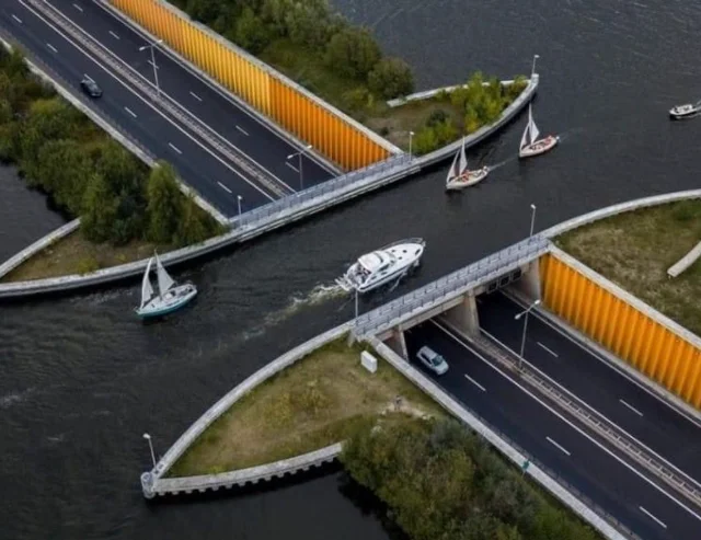 Этот акведук в Велювемере в Нидерландах - мост, через который лодки могут пересекать дорогу, в то время как автомобили движутся безопасно внизу.