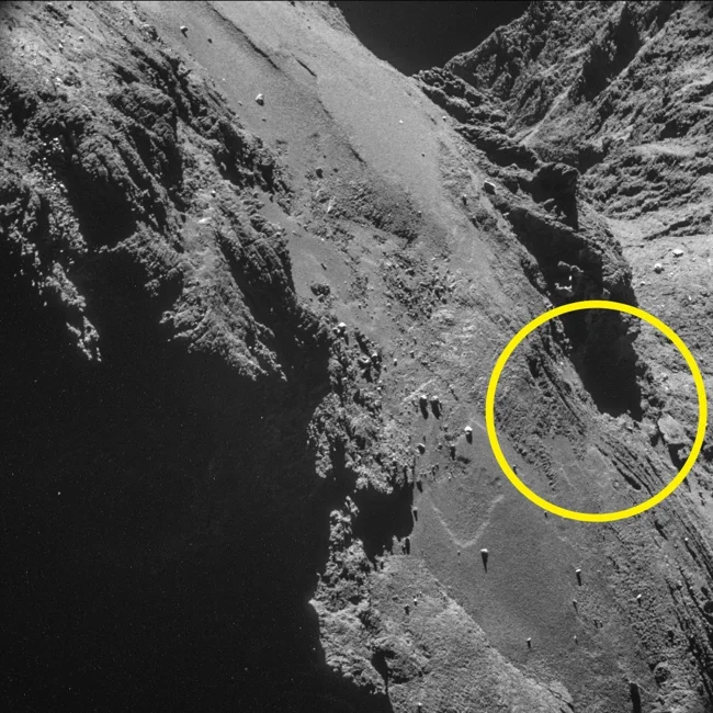 На этом снимке большой доли кометы Чурюмова — Герасименко особое внимание привлекают ряды длинных параллельных бороздок и гребней в центре кадра — наложенные друг на друга природные образования способны поведать историю протяженностью в миллиарды лет.