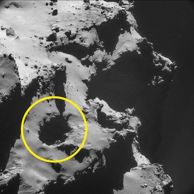 Считается, что эти округлые впадины могут быть связаны с источниками активности кометы, возможно, с выходами газа из пористых недр.