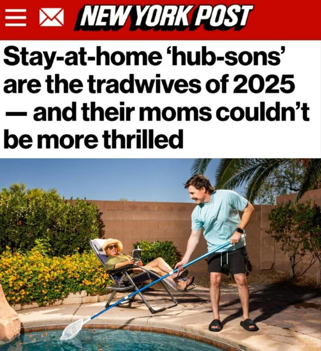 Мир потихоньку переворачивается с ног на голову. Взрослые парни поколения Z и миллениалы всё чаще бросают работу, возвращаются в родительский дом и берут на себя домашние обязанности в обмен на содержание. Это зеркальное отражение «традиционных жён», только теперь мужчины готовят ужин, ходят за продуктами, убирают и чинят вещи по дому, пока мама работает.