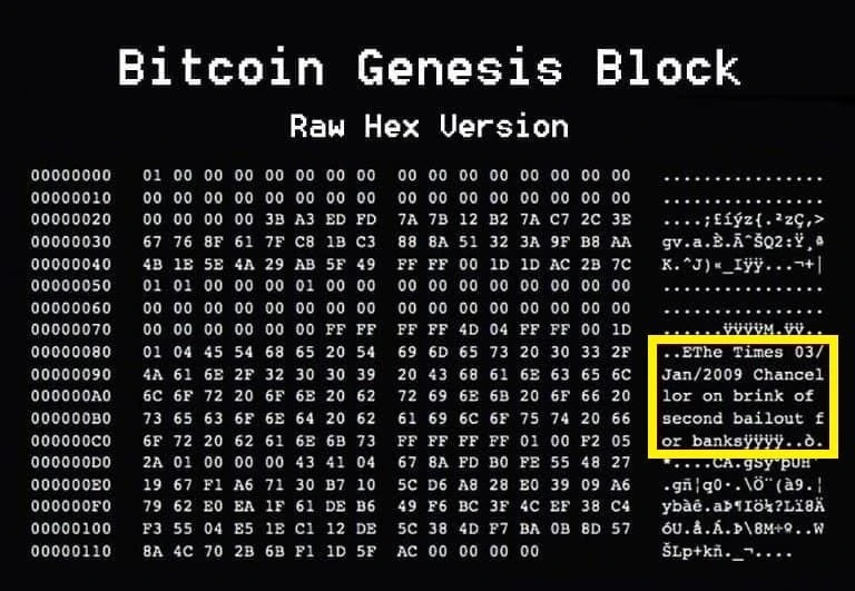 Почему именно этот текст — никто не знает. Одни считают это намёком на британское происхождение Сатоши, другие — прямой критикой современной банковской системы и политики «спасения» банков за счёт общества.