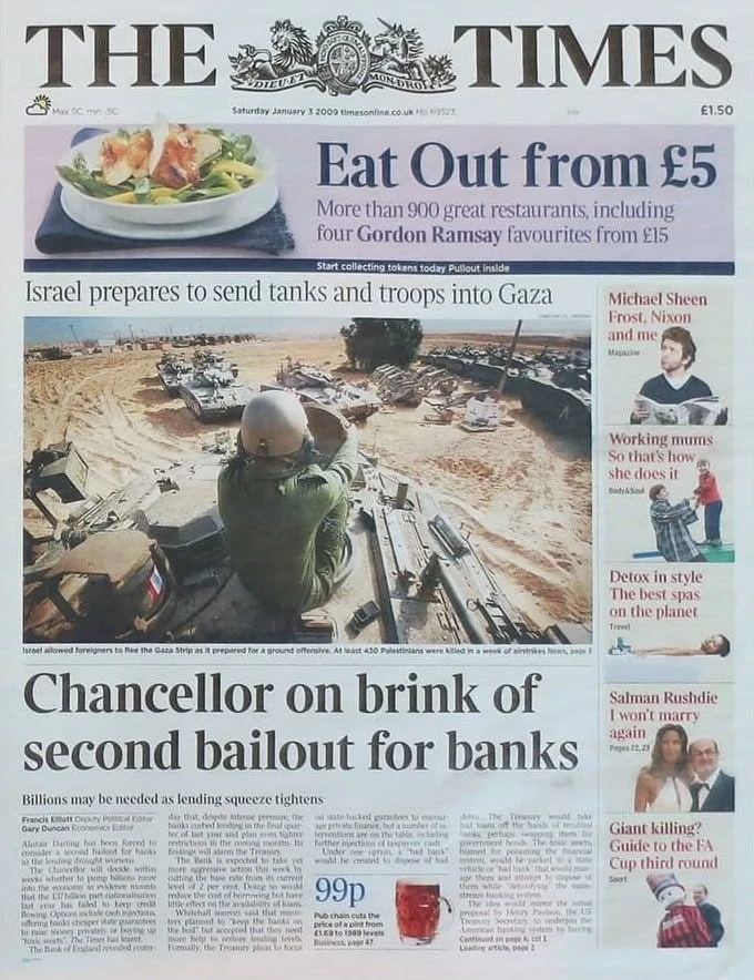 Создатель сети, Сатоши Накамото, получил первые 50 $BTC и оставил в хеше блока скрытое сообщение — заголовок газеты The Times: «Chancellor on brink of second bailout for banks» — «Канцлер на грани второй помощи банкам».