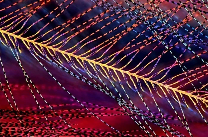 Пуховые перья большой синицы состоят из волокон, которые работают как природная дифракционная решетка, обеспечивая переливание всеми цветами радуги.