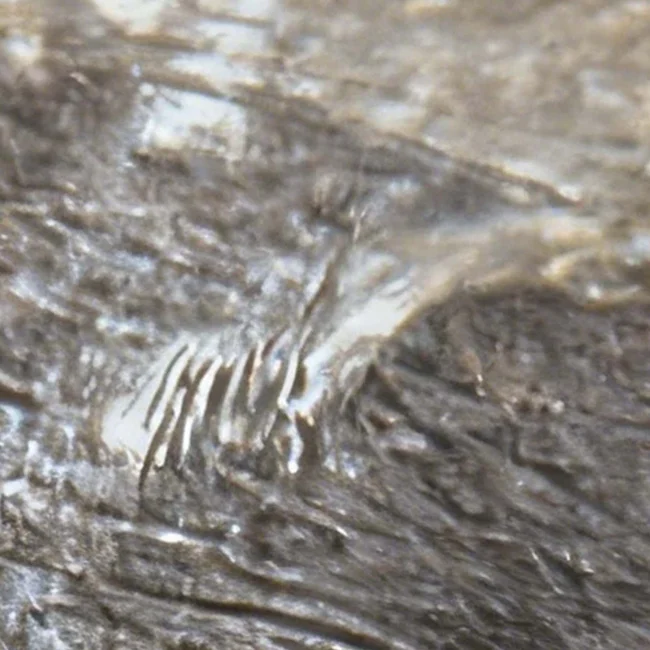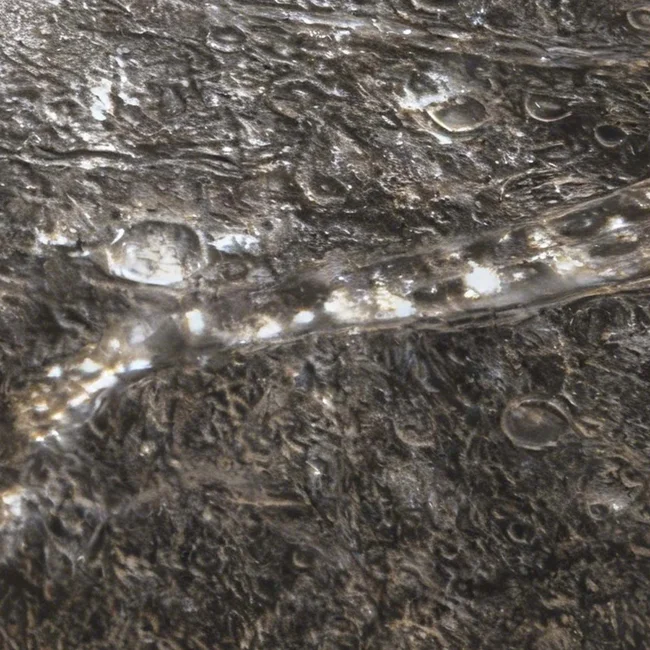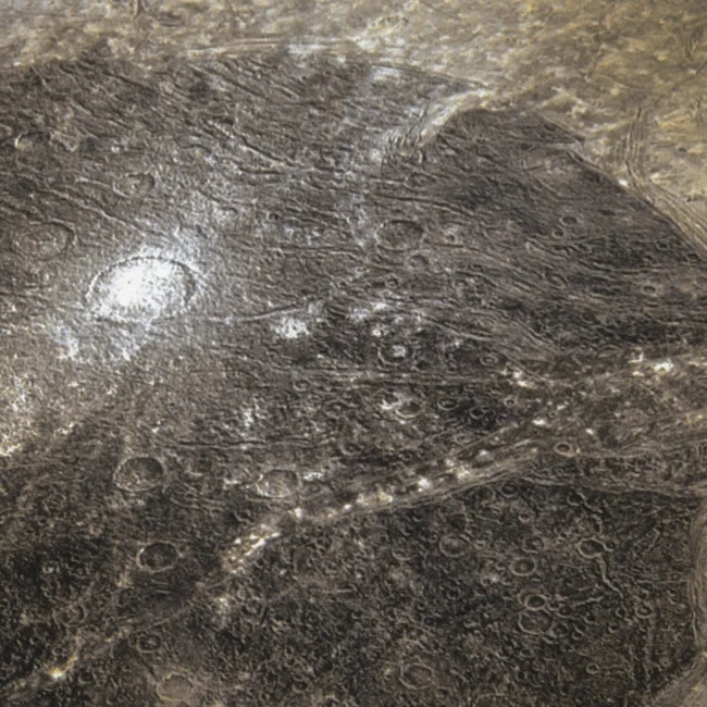 Обратите внимание на яркие белые пятна. Это залежи чистейшего водяного льда, отражающие большую часть падающего солнечного света. Присутствие большого количества льда в кратерах можно объяснить тем, что его доставило ударное тело, или же тем, что часть ледяной коры была расплавлена, обновив материал под слоем пыли. Но лед в разломах, вероятно, связан с океаном.