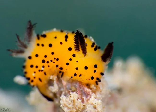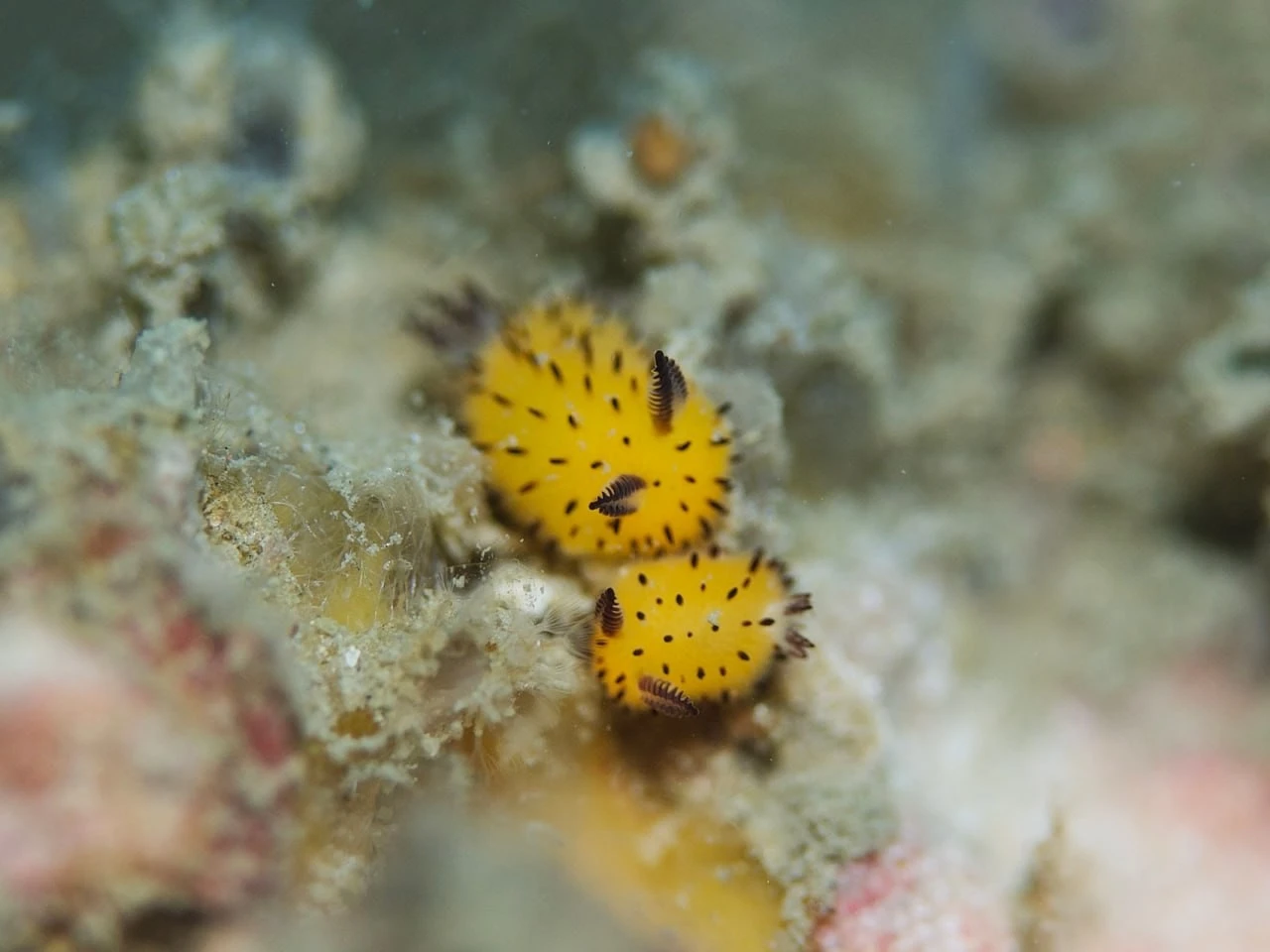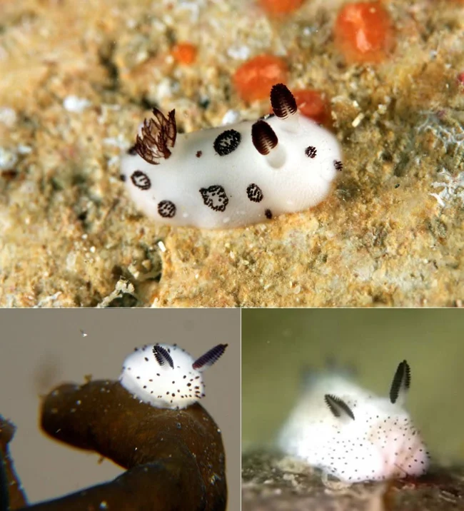 Перед вами морские кролики — Jorunna parva. Эти слизни покрыты крошечными «иголками», которые напоминают мех, а из их головы торчат ринофоры, похожие на ушки. Внешние жабры на задней части животного напоминают хвост.