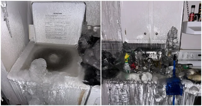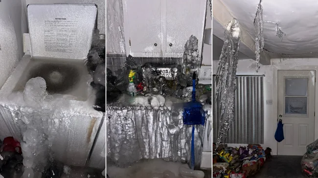 Для Квебека, где морозы не шутят, это закончилось катастрофой. Когда владелец подъехал к дому, то увидел не просто "беспорядок", а настоящий "ледяной замок". Трубы лопнули, превратив двухэтажную квартиру в гигантский морозильник. Лед сковал всё: от кухонных шкафов, с которых свисают сталактиты, до стиральной машины, где в ледяной плен навсегда ушли чьи-то носки.