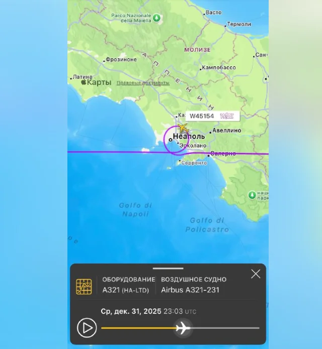 В новогоднюю ночь пилот Wizz Air совершил круговой полет над Неаполем, чтобы пассажиры смогли любоваться множеством салютов одновременно. Рейс W45154 прошел прямо над городом в полночь, и командир экипажа не упустил возможность запечатлеть этот праздничный фейерверк. ![]()