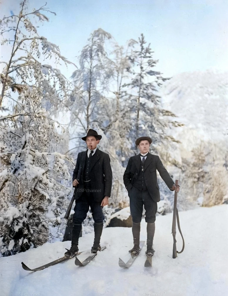 Рагнвальд Хальбренд и Герман Гримеланд на лыжах. Норвегия, 1915 год.
