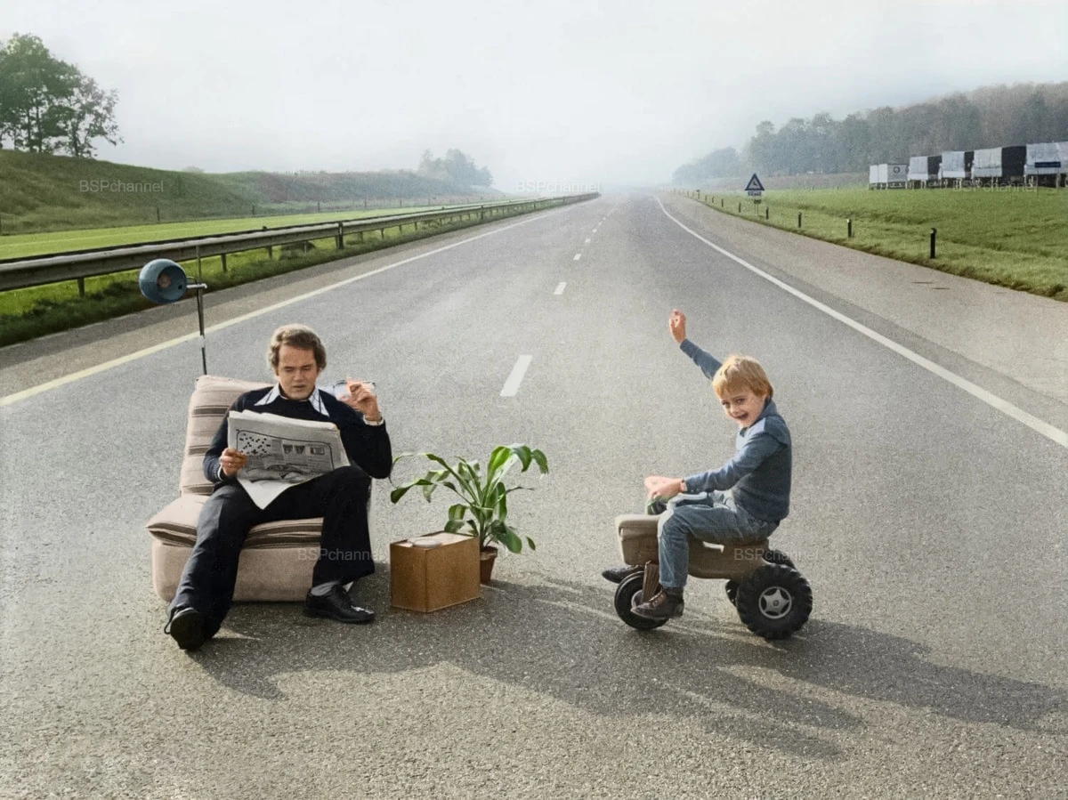 Отец с сыном на пустынной автомагистрали во время акции «Воскресенье без автомобилей» Нидерланды, 1973 год.