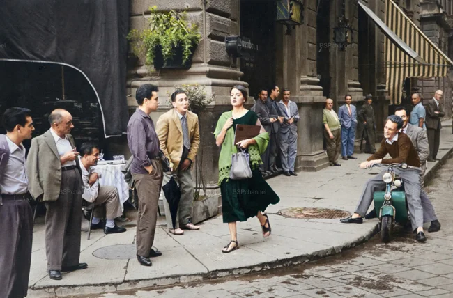 В 1951 году, во время путешествия по Европе, американская фотограф Рут Оркин создала свой самый знаменитый снимок — «Американка в Италии». На кадре молодая туристка из США, заблудившаяся в лабиринте узких римских улочек. Пытаясь найти дорогу, она обратилась за помощью к местным жителям, отдыхавшим в тени во время сиесты. Но никто из них не говорил по-английски — за исключением, пожалуй, водителя мотороллера, который, по крайней мере, сделал вид, что понимает. В тот самый момент один из мужчин громко бросил сальную шутку на итальянском. На улице взорвался хохот и именно эту секунду, полную неловкости, иронии и напряжённого одиночества в толпе, запечатлела Оркин.