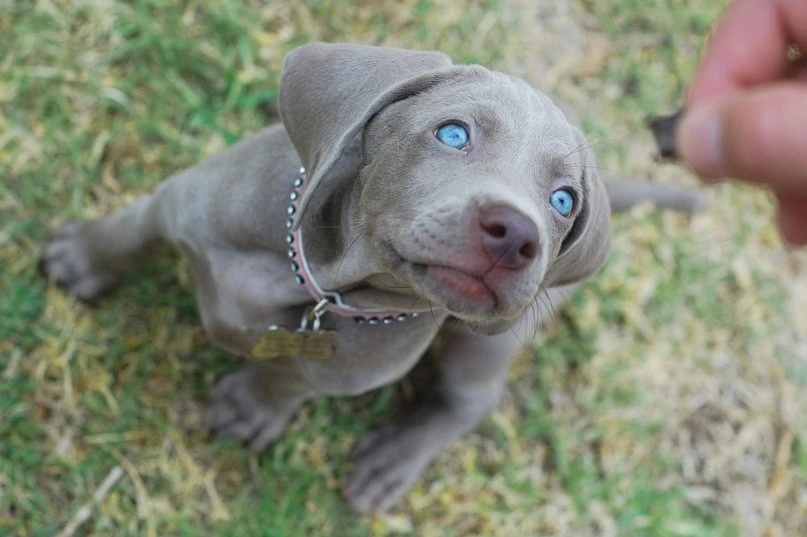Щенки веймаранера имеют ярко-голубые глаза, которые с возрастом обычно меняются на серые или смешанные.