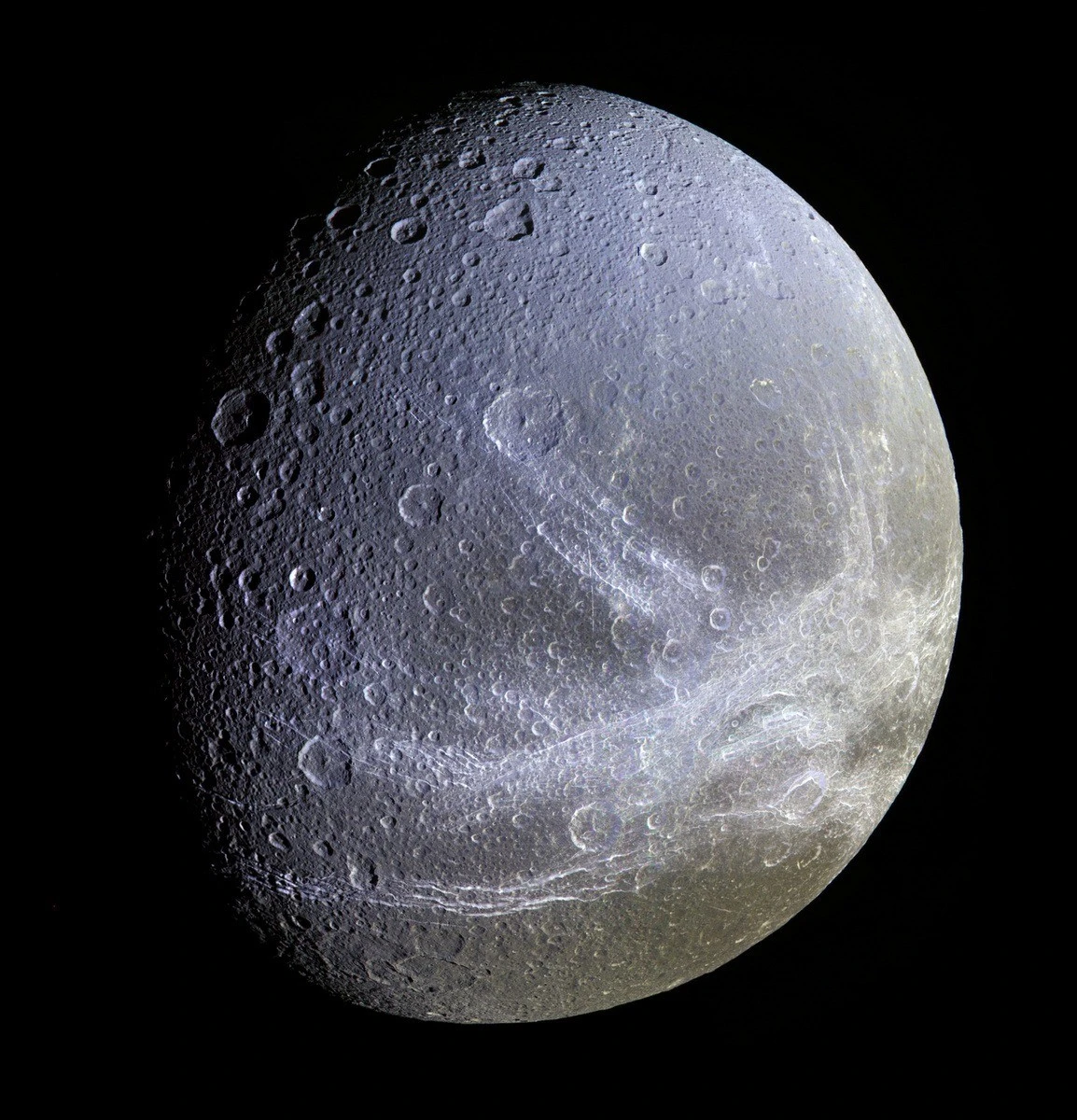 Диона — четвертый по величине спутник Сатурна со средним диаметром 1 123 километра, состоящий преимущественно из водяного льда. Снимок был сделан 21 июня 2015 года космическим аппаратом NASA "Кассини".