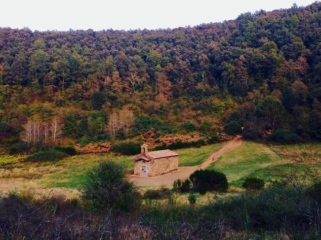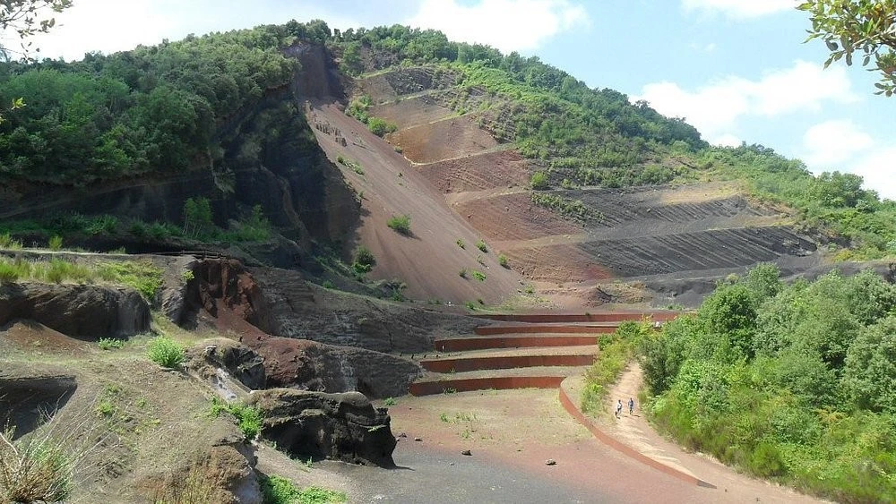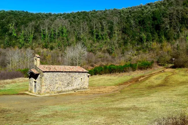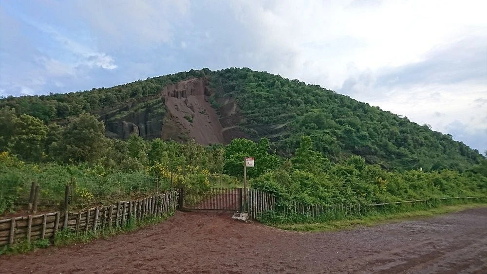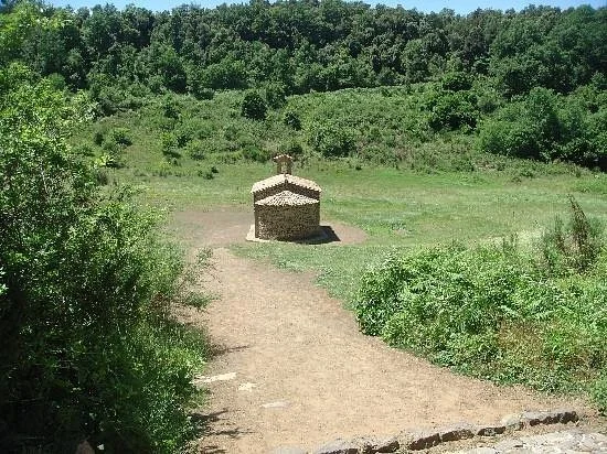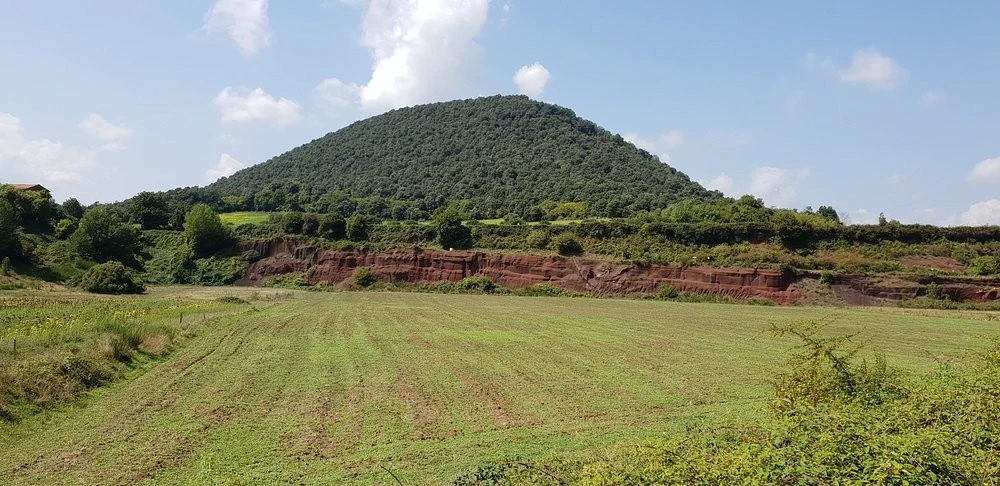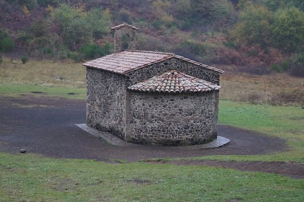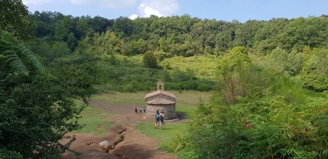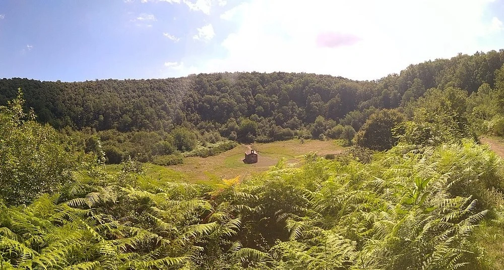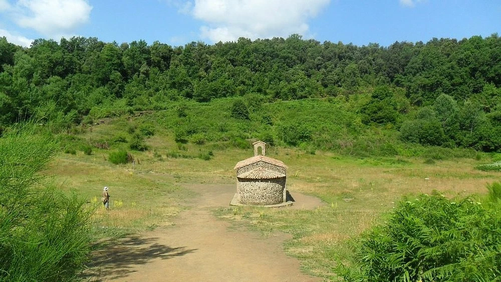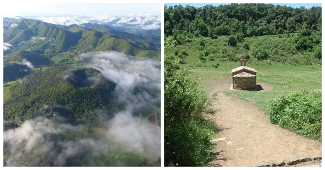 Из них вырос конический холм высотой более шестисот метров. На его вершине образовался широкий круглый кратер. Сегодня его дно устлано густым ковром травы и кустарников, а склоны вулкана покрыты лесом. И посреди этого зелёного амфитеатра, прямо в центре кратера, стоит романская часовня.