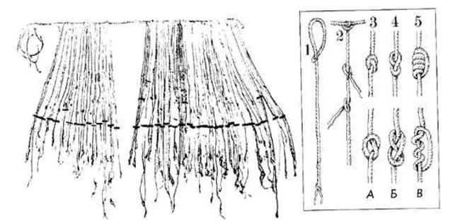 Это устройство представляло собой главный шнур-основу, от которого отходило множество нитей из шерсти или хлопка, окрашенных в разные цвета. На этих нитях завязывались узлы, и именно в их расположении, типе, количестве витков и в оттенках самой нити заключался зашифрованный смысл.