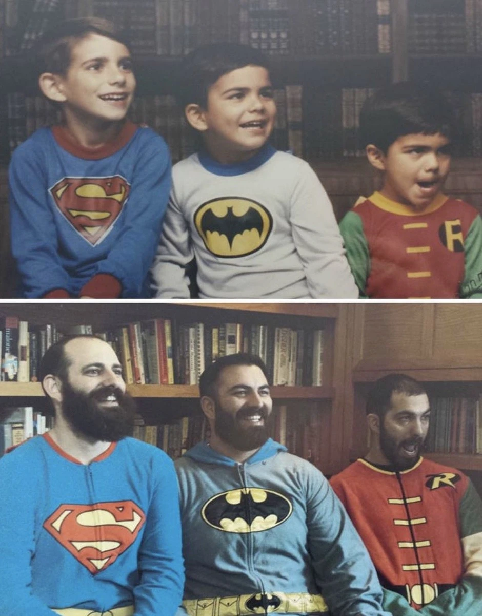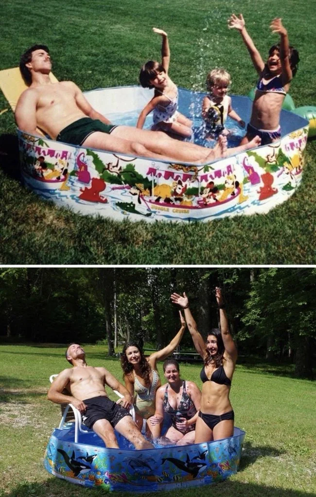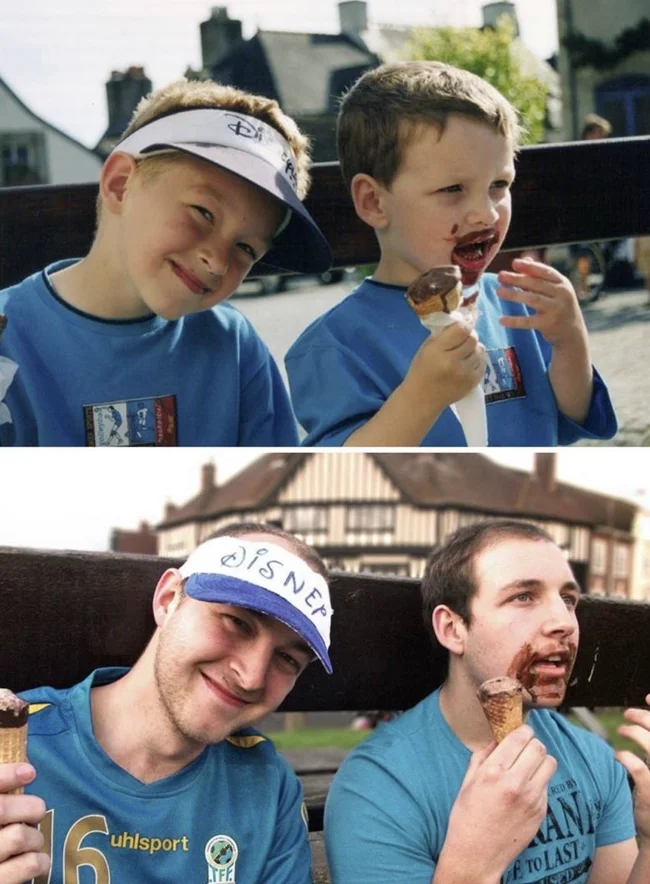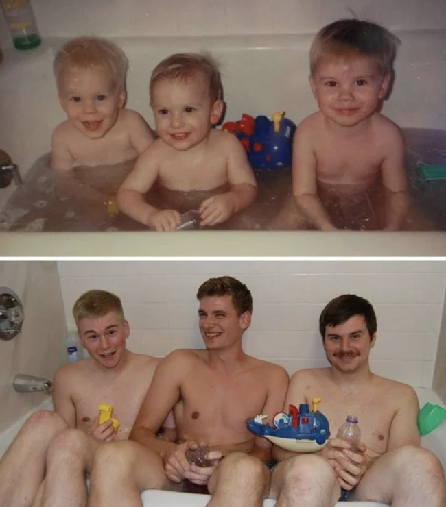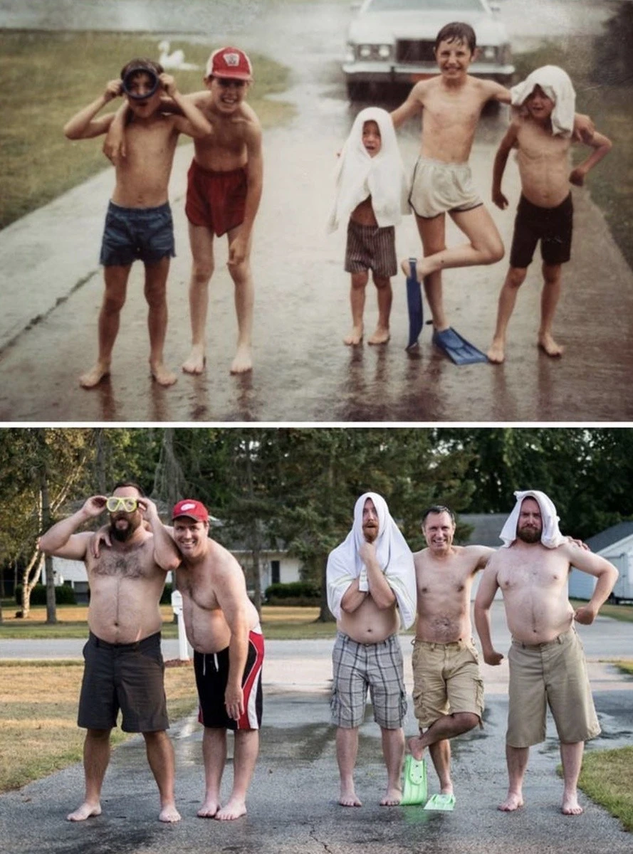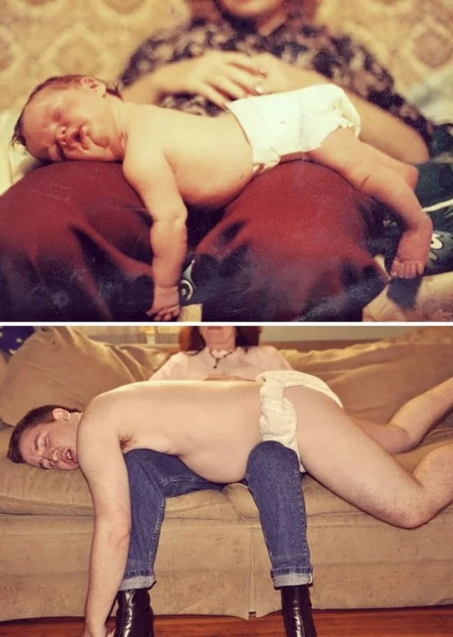 Мало кто может внятно объяснить, зачем их тянет переснимать старые фото, да еще и непременно в тех же позах и одежде. Вроде ностальгия чистой воды, но с другой — до чего же нелепо выглядят дядьки и тетки, когда косплеят младенцев. С другой стороны, в этом и суть, показать, насколько данные персонажи изменились