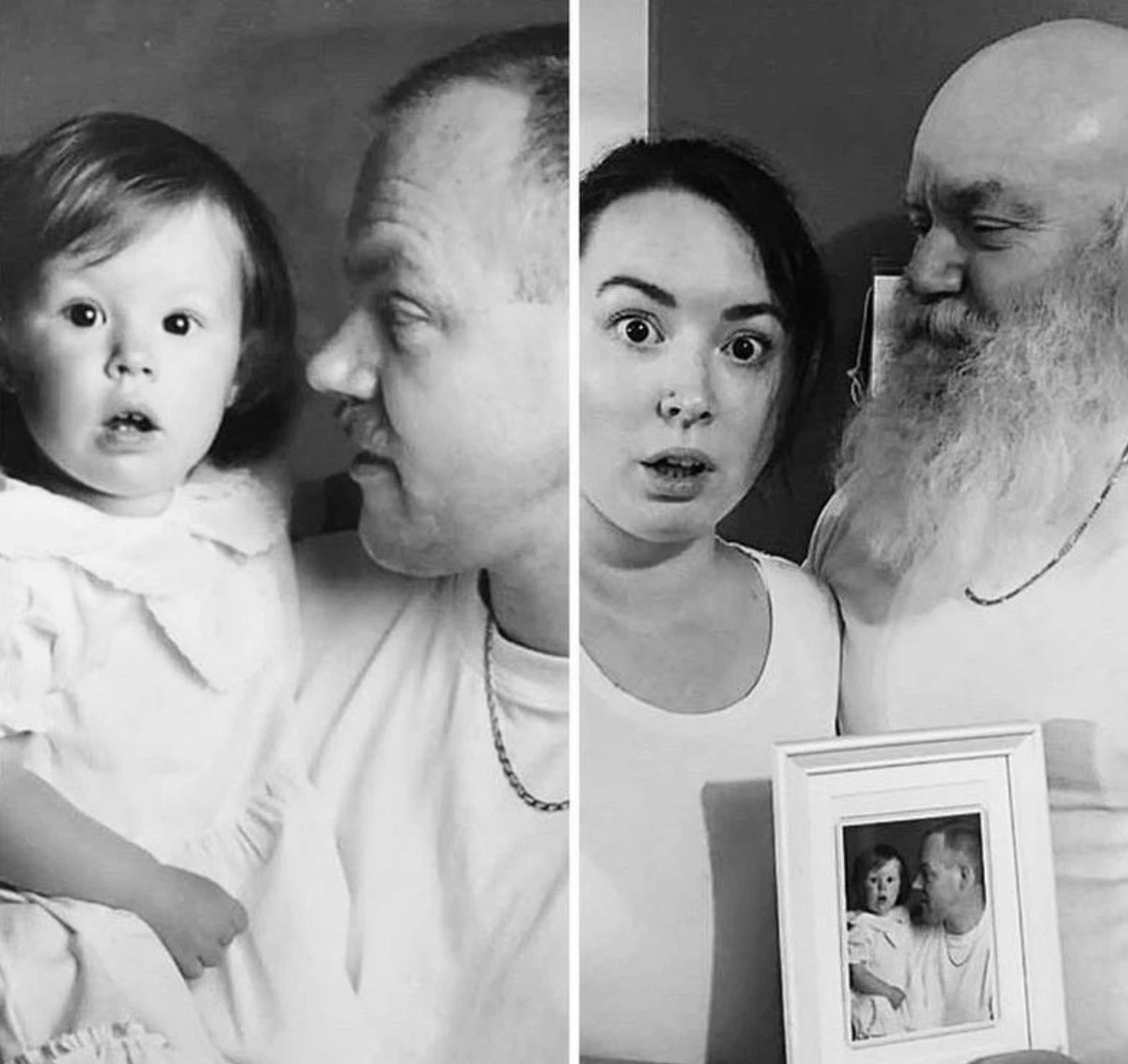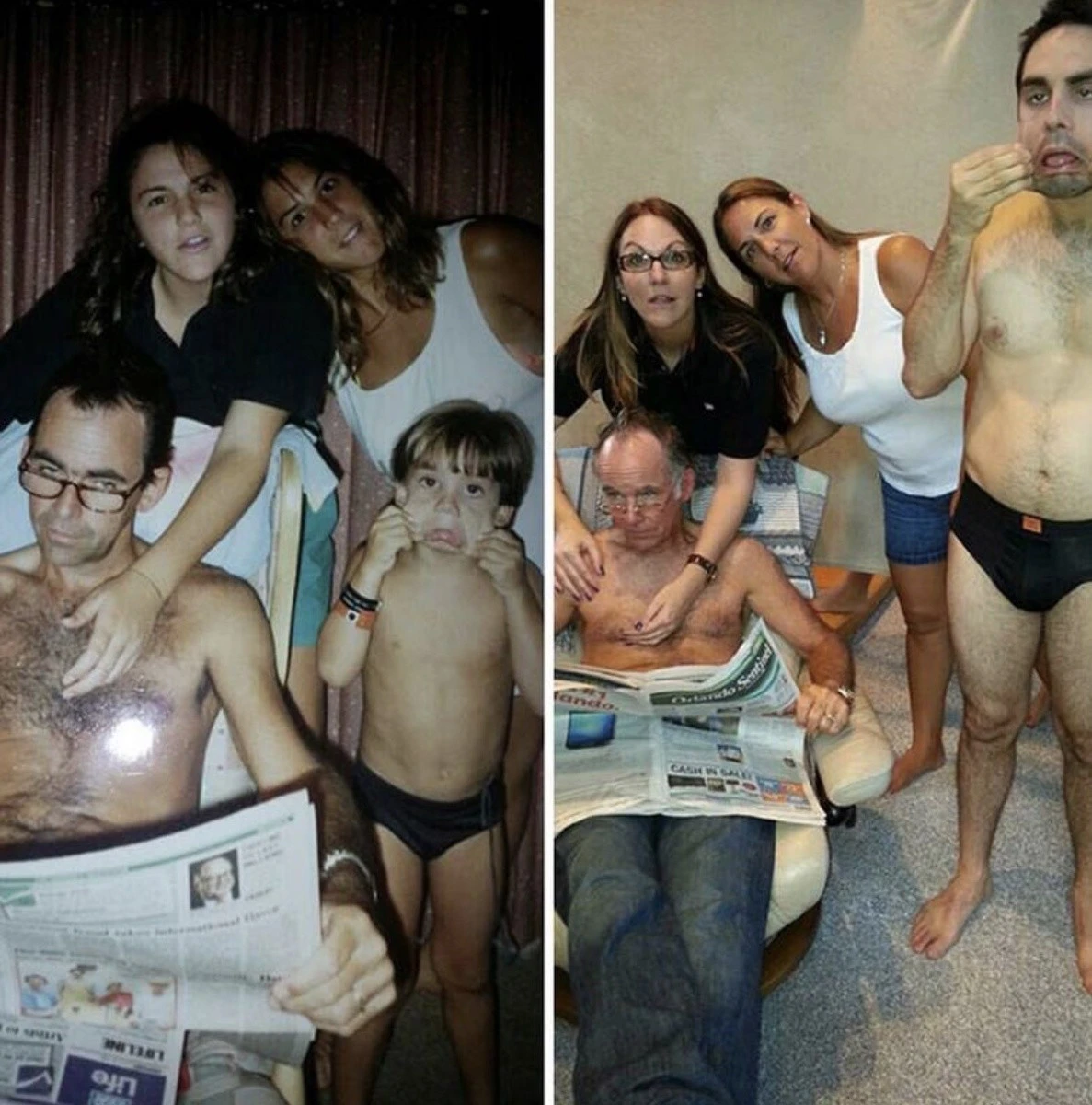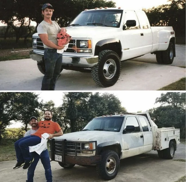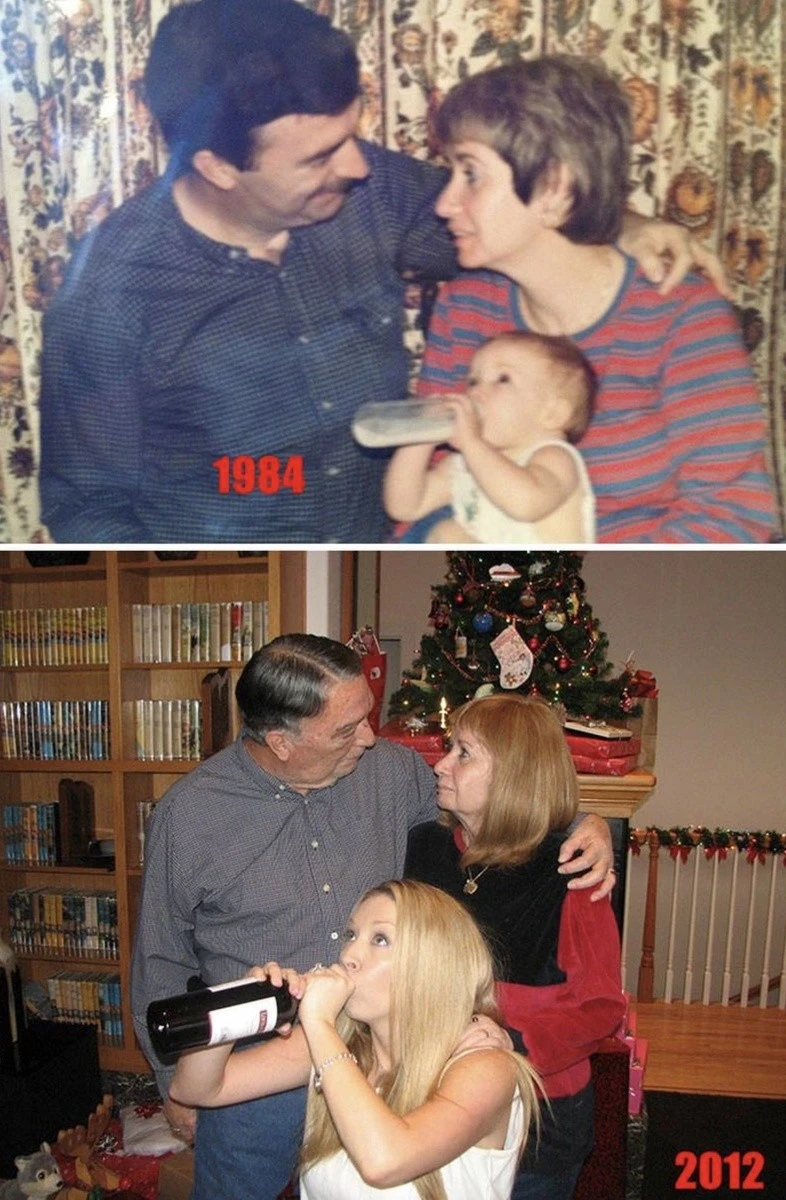 Мало кто может внятно объяснить, зачем их тянет переснимать старые фото, да еще и непременно в тех же позах и одежде. Вроде ностальгия чистой воды, но с другой — до чего же нелепо выглядят дядьки и тетки, когда косплеят младенцев. С другой стороны, в этом и суть, показать, насколько данные персонажи изменились