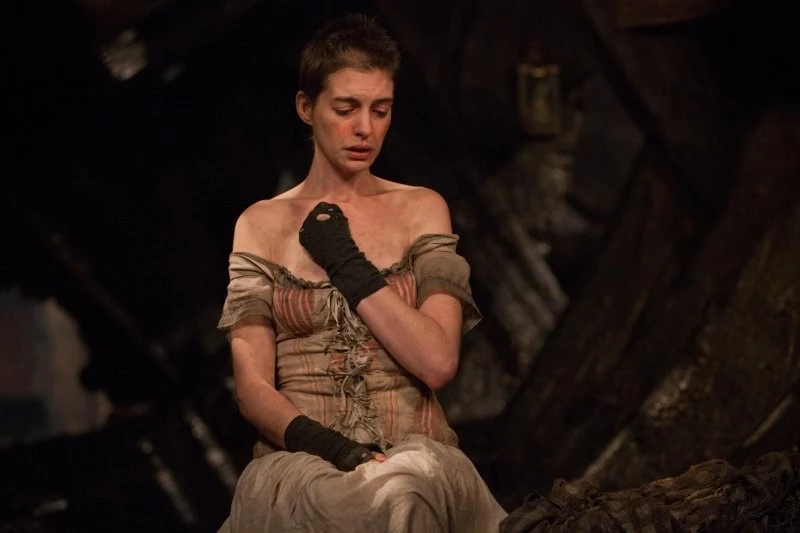 Девушка в рваном платье и перчатках без пальцев сидит, сгорбившись и обессилев, на фоне тёмного грязного помещения. Безысходность, отчанье, пустота читаются во взгляде. Незабываемая роль Фантины в «Отверженных» досталась Энн Хэтэуэй ценой ужасных условий. Во время исполнения сольной партии «I Dreamed a Dream» она снималась на площадке, заполненной гнилой рыбой, чтобы усилить ощущение упадка и нищеты.