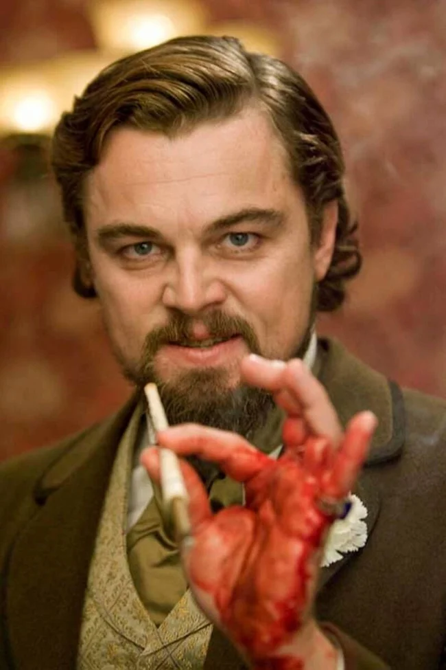 Мужчина с окровавленной ладонью держит сигарету и ухмыляется, глядя в камеру. Сцена выглядит до дрожи настоящей. В «Джанго освобождённом» Ди Каприо в порыве гнева ударил рукой по столу и случайно разбил бокал. Осколок глубоко впился в его ладонь, кровь хлынула на пол, но актёр не вышел из образа. Ничего особенного, просто типичный Лео.