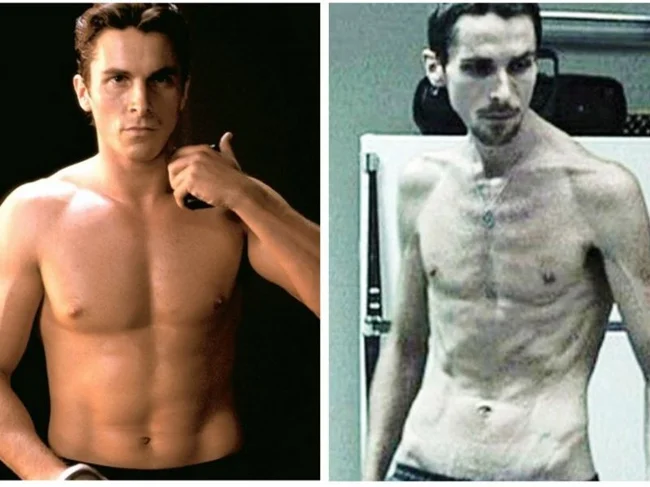 Мускулистый мужчина позирует без рубашки с бритвой в руке, а рядом контрастное изображение его же исхудавшего до состояния скелета тела. Жутко, правда? Для «Машиниста» Кристиан Бейл довёл своё тело до предела. Он сбросил 25 килограммов всего за четыре месяца, питаясь чёрным кофе, яблоком и банкой тунца в день.