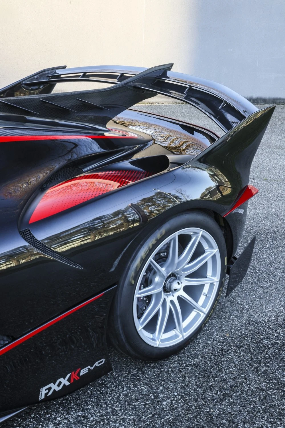 Вариант Evo появился у FXX K в 2017-м, отличаясь главным образом пересмотренным аэродинамическим оперением — его эффективность удалось повысить на 23%. Массу суперкара уменьшили на 90 килограммов. По некоторым оценкам, всего модернизированных суперкаров выпустили около десятка (включая выставленный на продажу), хотя общий тираж FXX этого поколения — примерно 40 машин.