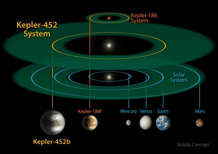 Размеры и масштабы системы Kepler-452 сравниваются с размерами системы Kepler-186 и Солнечной системы. Kepler-186 — это миниатюрная солнечная система, которая полностью поместилась бы внутри орбиты Меркурия.