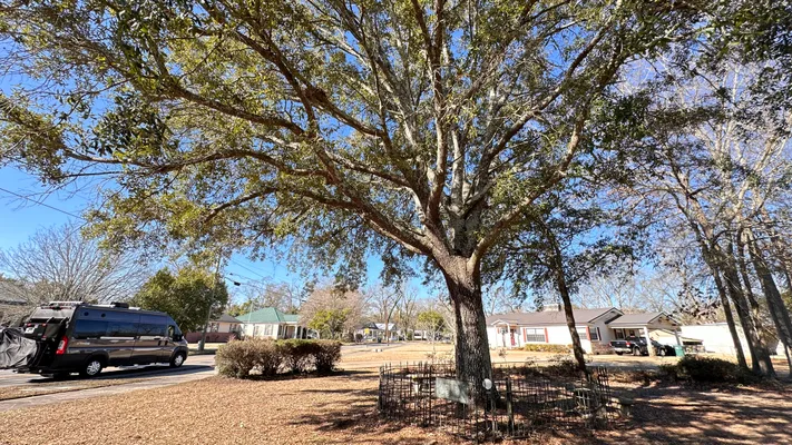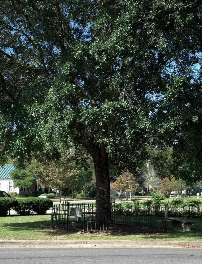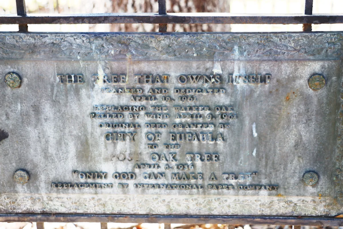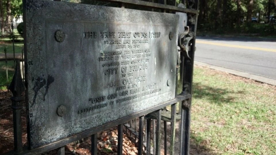 На крохотном участке земли возвышается высокий дуб, корни которого глубоко вросли в почву, юридически принадлежащую только ему. Эта удивительная автономия началась в 1935 году, когда мэр Юфолы Э. Х. Грейвс подписал особый документ.