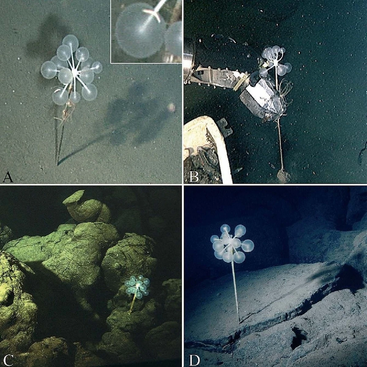 Глубоководная губка Пинг-понговое дерево. Хищник, ждёт пока на клейкие шарики налипнет планктон или какая-нибудь креветка или маленькая рыбка, чтобы медленно поглощать его внутрь