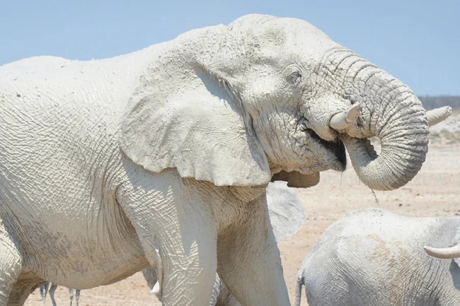 Белые слоны из Национального парка Этоша в Намибии. Живут в пустыне и регулярно обмазываются местной грязью, отчего всегда ходят белоснежные