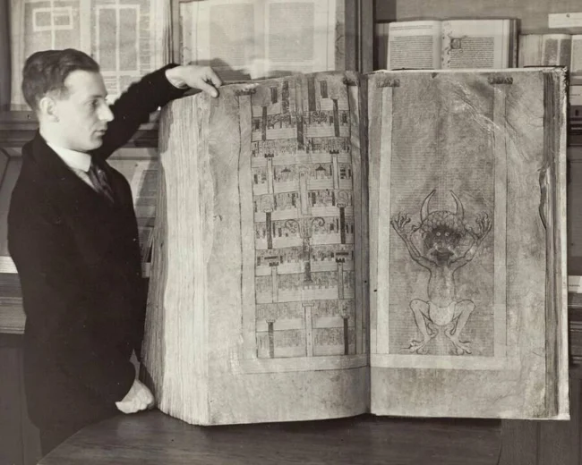 Согласно преданию, монах Герман, приговорённый к замурованию заживо, вымолил шанс: создать за ночь книгу всех знаний. Не сумев, он призвал Дьявола, обменяв душу на готовый фолиант. К утру книга лежала на алтаре. Исторический факт добавляет интриги: на одной из страниц стоит подпись писца: Hermanus Inclusus — «Герман Заточенный». Это слово означало как наказание, так и добровольное затворничество. Был ли он грешником или аскетом? Подпись лишь углубляет загадку.
