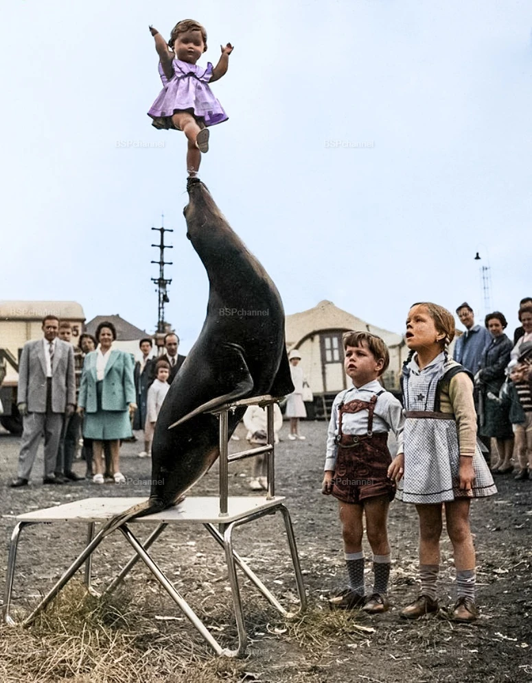 Морской котик, балансируя куклой, развлекает детей, пришедших на представление цирка "Кроне". Аахен, ФРГ, 1962 год.