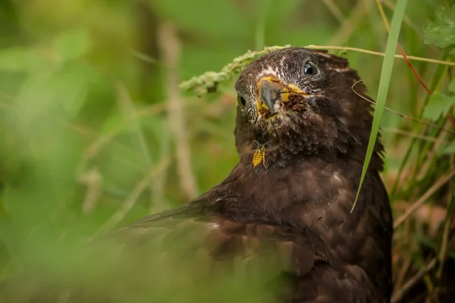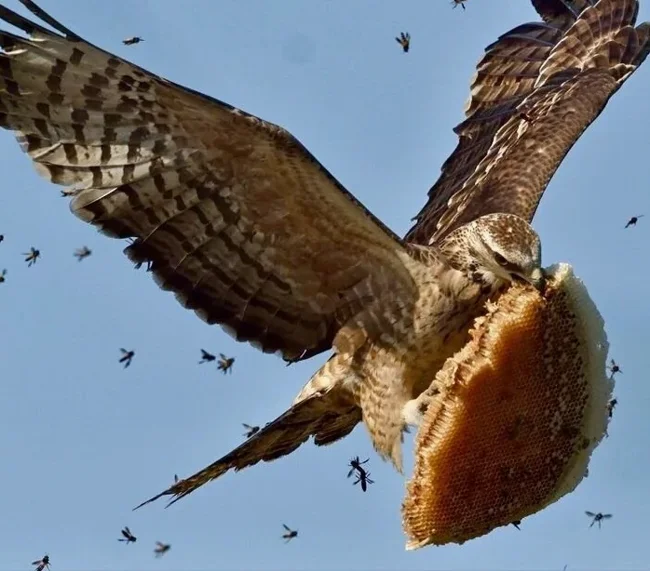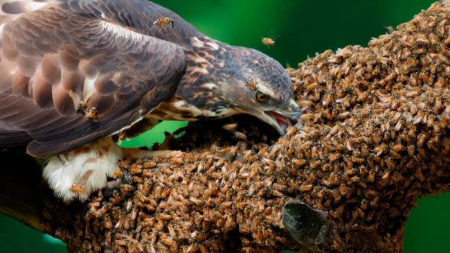 Но вот что неожиданно: сам осоед не имеет абсолютной защиты от своей же добычи. Да, его плотное оперение отлично прилегает к телу и является настоящей чешуйчатой бронёй, но забраться под неё более чем реально. Да, осоед имеет высокую устойчивость к компонентам пчелиного яда, но устойчивость эта не абсолютна. Десяток уколов — и осоед свалится, как свалился бы любой из нас.