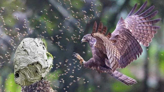 Сила осоеда кроется не столько в защитных механизмах, которые он использует, сколько в грамотной тактике атаки. Его главное преимущество перед пчёлами — это скорость и фактор внезапности. И чтобы не потерять их, он должен провернуть атаку всего за пару минут. И осоед справляется. Он стремительно пикирует на дом пчёл, разрывает его своими мощными когтями и клювом, жадно глотает личинок и отступает до того, как большая часть ВВС гнезда успеет сообразить, а что, собственно, произошло.