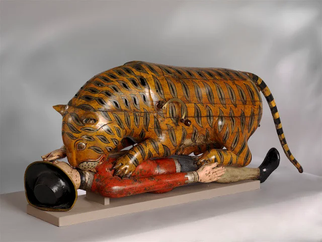 Почти в натуральную величину, жертва лежала на спине, в то время как зверь впивался клыками в её горло. В боку тигра торчала рукоятка. Если её вращать, скрытый механизм поднимал и опускал руку несчастного, а встроенные меха издавали рычание зверя и душераздирающие крики. Откидная створка на теле тигра открывала доступ к миниатюрному органу с клавиатурой.