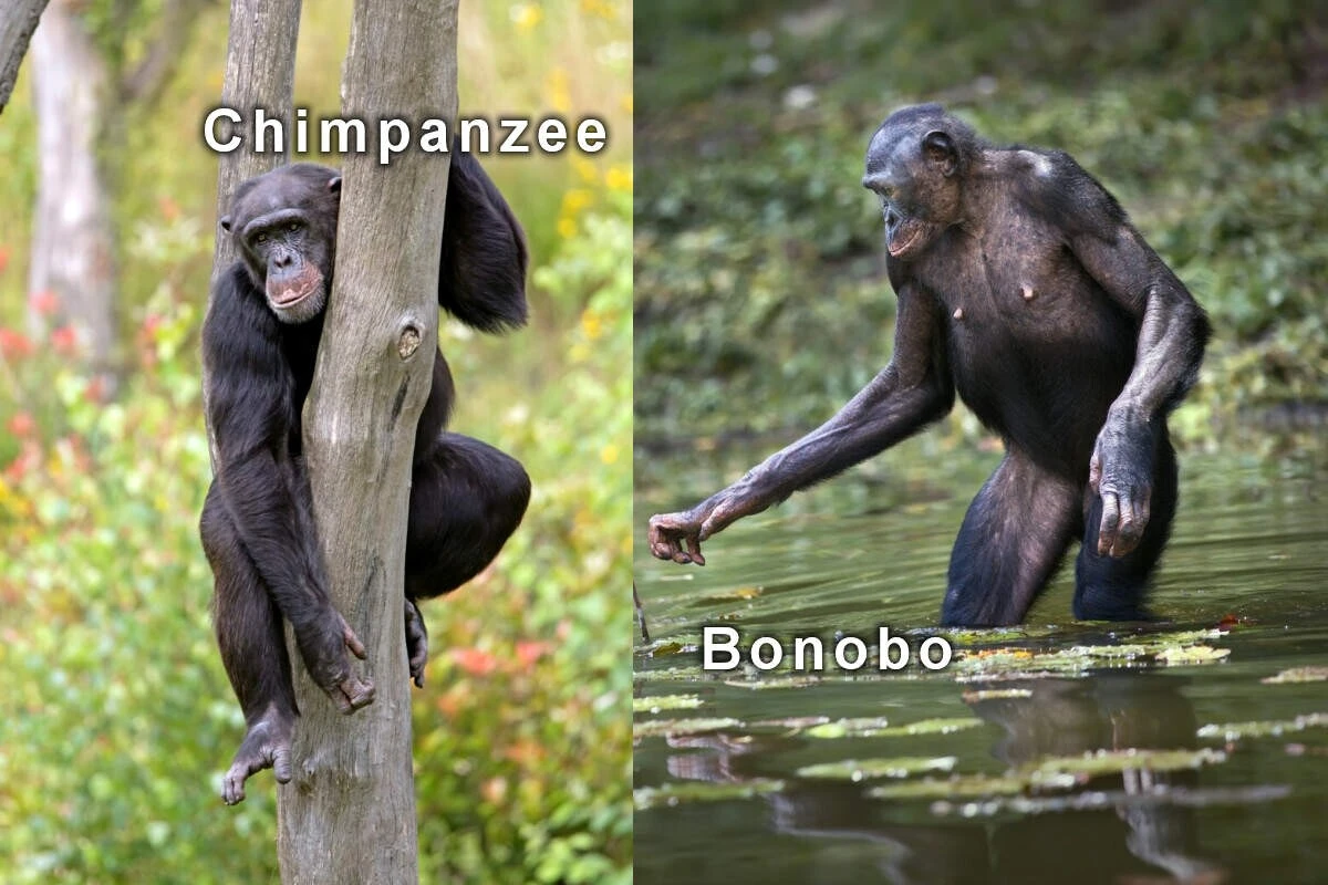 Внешне друг от друга оба вида почти не отличаются. Разве что бонобо чуть более стройные и чуть менее волосатые. Зато внутреннее наполнение приматов такое разное, будто бы они вообще никогда родственниками не были.