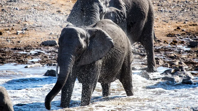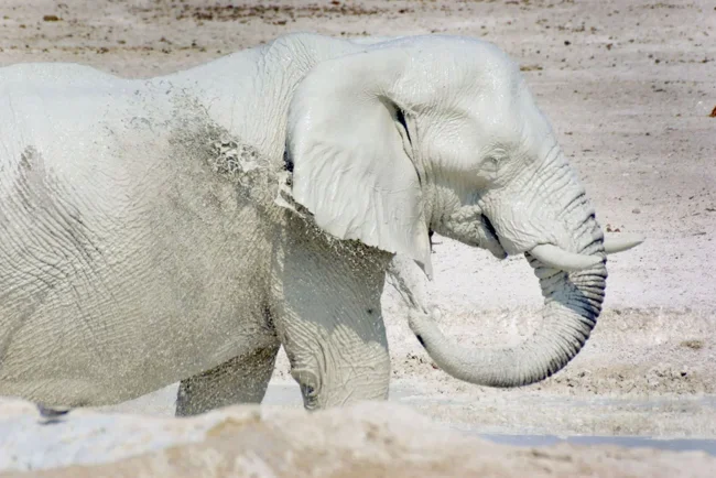 Национальный парк находится на самом севере Намибии, а это очень, очень сухая земля. Большую часть года Этоша представляет собой голую пустошь, посреди которой разбросана россыпь изумрудов-оазисов, в которых и концентрируется вся местная жизнь. И местные слоны прекрасно адаптированы к таким условиям. Их стада странствуют от оазиса к оазису, где находят себе временный приют, пищу и, конечно, возможность покупаться и поваляться в жидкой грязи. Очень светлой и глинистой грязи.