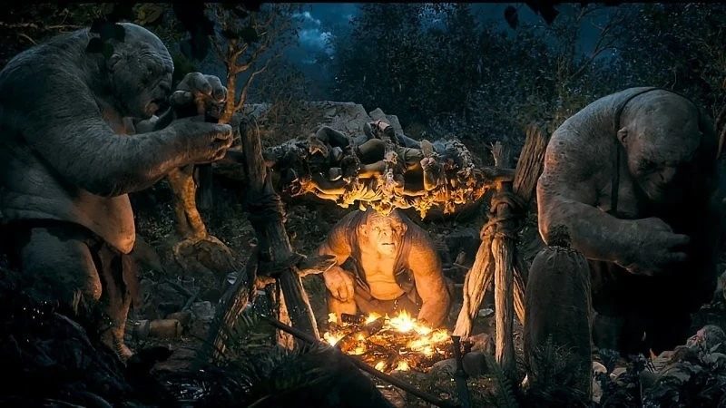 Во второй главе «Жареное мясо» Бильбо Бэггинс и его спутники попадают в ловушку к трём неприятным троллям (или великанам), которых удаётся перехитрить, заставив спорить до рассвета, когда солнечный свет превращает их в камень. Позже в книге героям приходится прятаться в пещере во время бури, чтобы избежать камней, которые швыряют горные великаны.