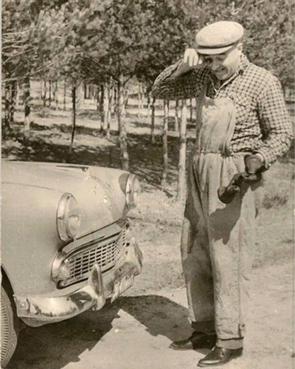 4. Владимир Этуш пытается починить свой Москвич-407. 1950-е годы