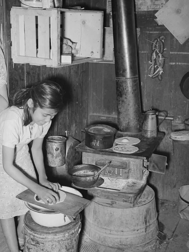 12. Счастливая мексиканская девочка делает тортильи и жарит их на дровяной плите в Робстауне, Техас, 1939 год
