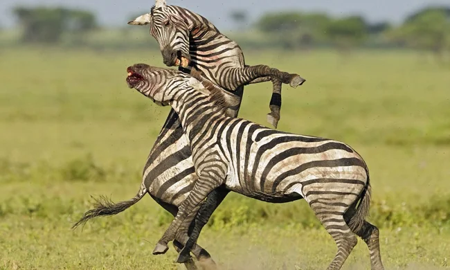 Итак, всё вроде бы приемлемо. Откуда драки и убийства? Во-первых, половозрелые самцы всех видов зебр нещадно дерутся за право обладания гаремом самок. Они лупят друг друга копытами, ломая кости, кусают, оставляя глубокие рваные раны, и стараются уронить оппонента на землю. После стычек победитель станет новым папочкой, а проигравший, ослабленный и побитый, рискует пойти на корм львам.