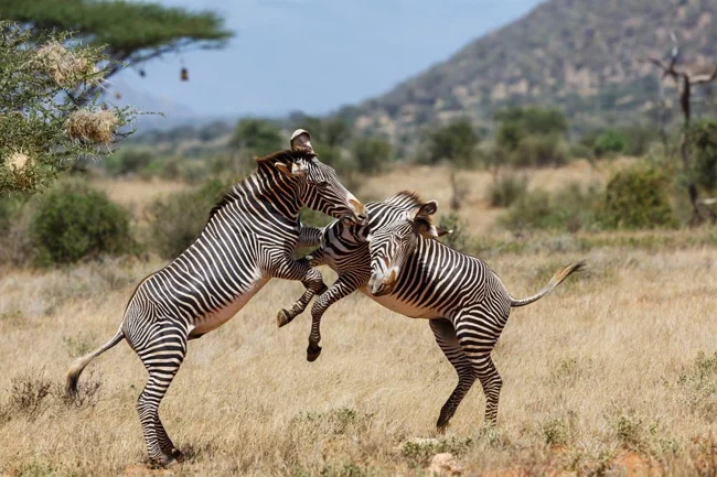 У третьего вида, зебр Греви, всё немного проще. Там самцы захватывают и охраняют отдельную территорию. Самки с детёнышами свободно путешествуют по саванне, пересекая участки разных жеребцов. Однако стычки за владения у них не менее жесткие, чем у других двух видов, что сражаются за гаремы.