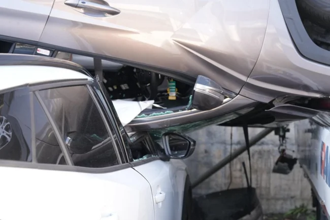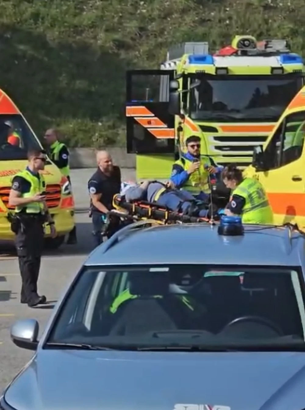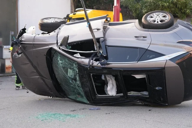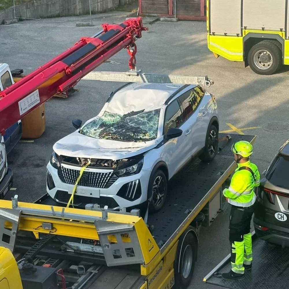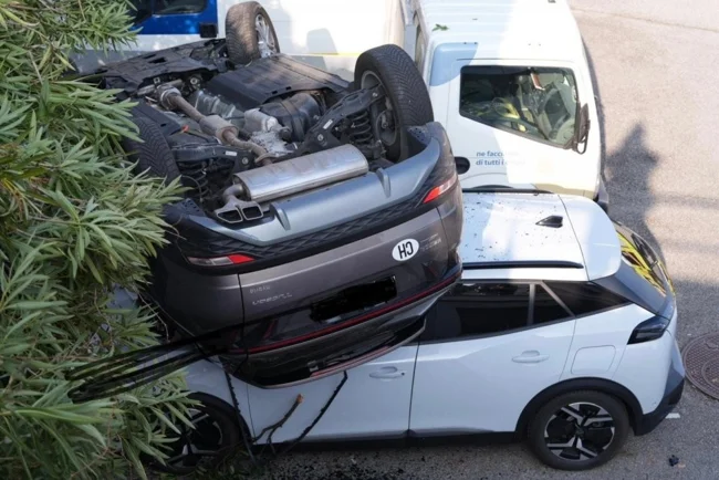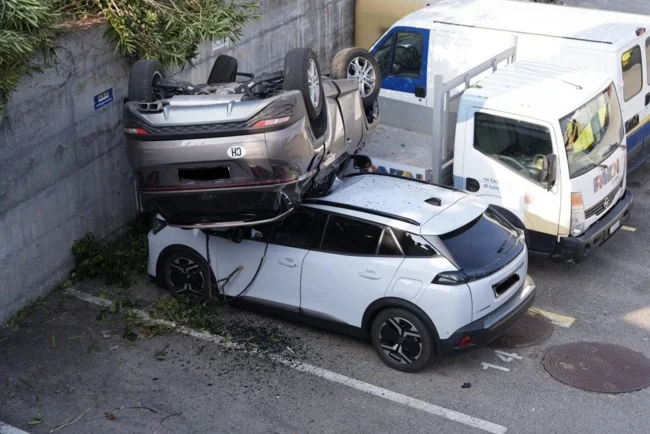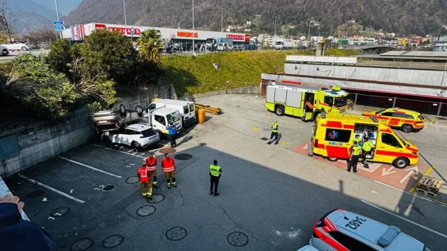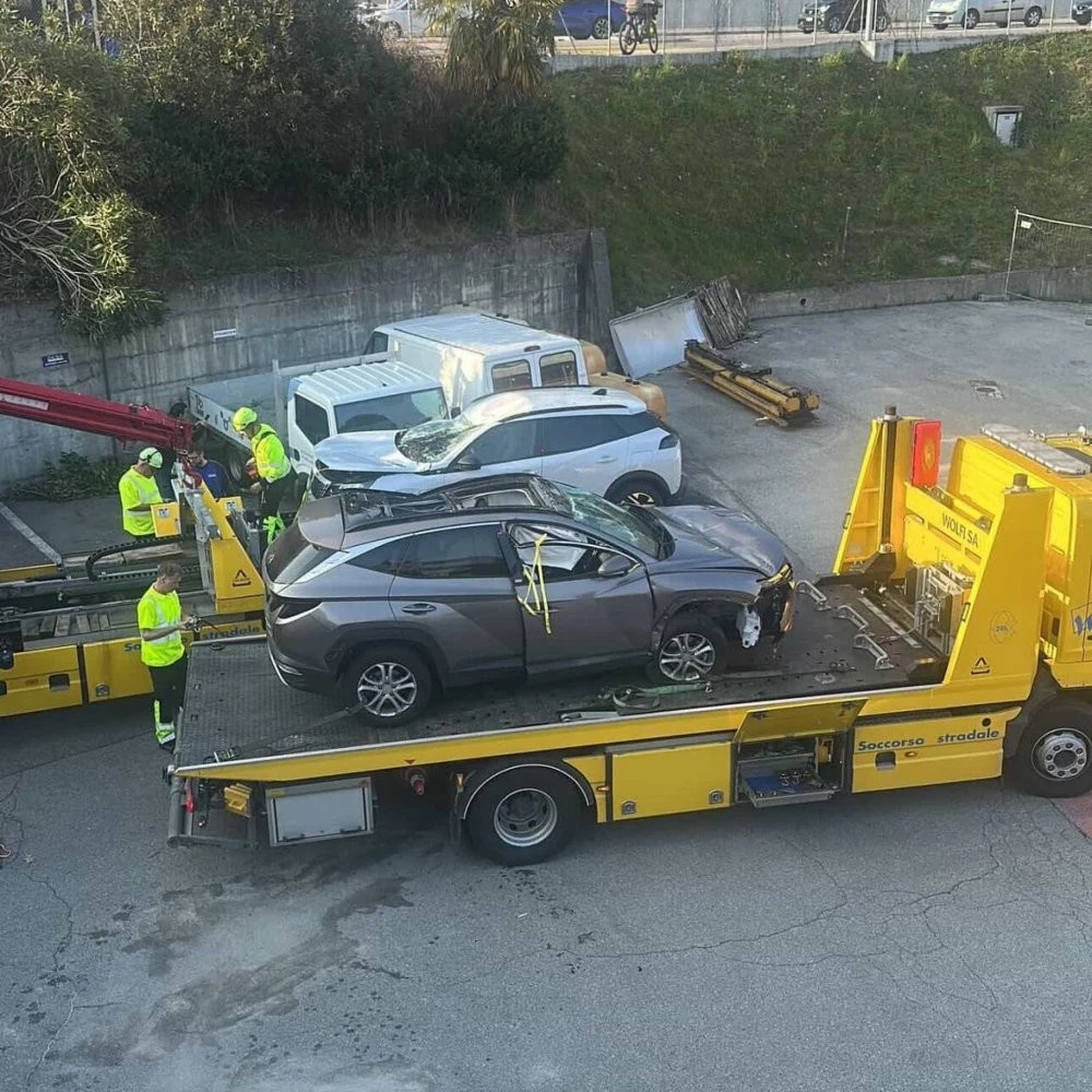 Пишут, что после ДТП с неподвижным автомобилем и "потери управления" (хотя выглядит как попытка бегства) машина съехала в кювет и перевернулась, упав на другие автомобили на парковке бывшего супермаркета "Ипергрос". Немного пострадали. Лосоне, Швейцария.